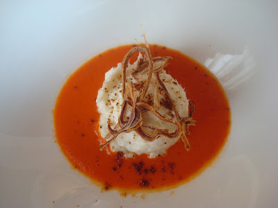 | Fondutina di peperoni, crema di baccalà, cipolla e polvere di pomodoro |
